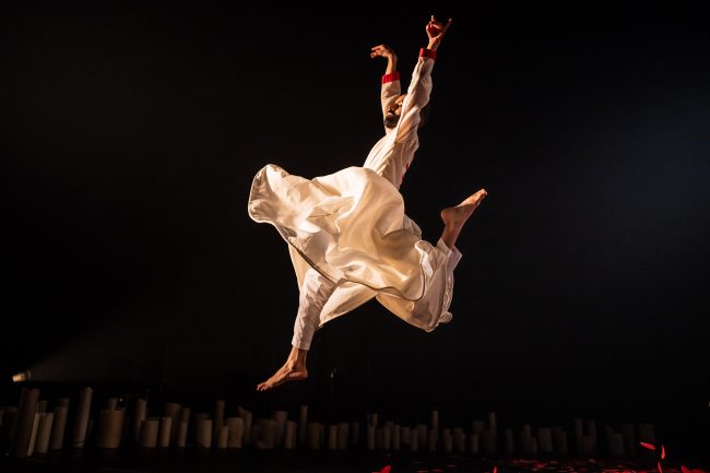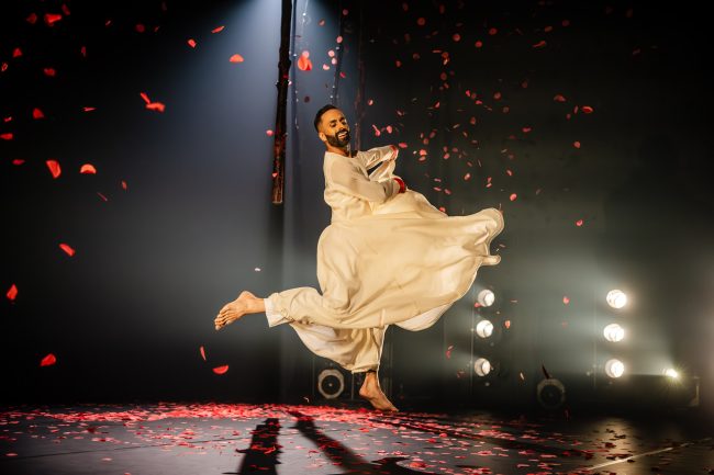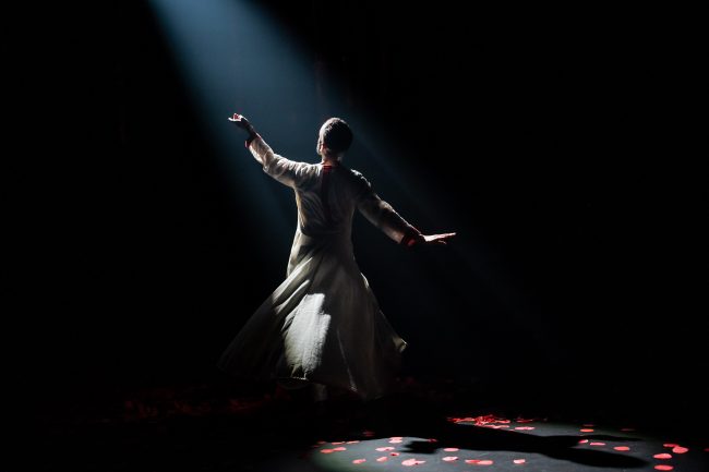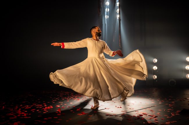Aakash Odedra is the creator and solo dancer in this production, that combines Kathak dance and Sufi storytelling. Kathak dance originated in Indian temples and moved to the royal courts during the Mughal period, picking up Persian influences along the way. After a decline during the British era, it was revived and is now a popular, internationally recognised art form. It involves complex, intricate footwork and rapid, controlled spins, and immediately we knew we were witnessing an expert dancer with Aakash, whose footwork was mesmerising in its speed and accuracy.