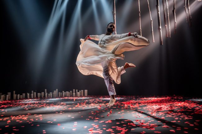 The score (Rushil Ranjan) played a major part in the show, being a dense blend of traditional instruments – like the tabla (Janan Sathiendran) and Indian wooden flute or bansuri (Praveen Prathapan) – and orchestral instruments with rich vocal songs and chants. The rhythms were infectious and intricate, motivating the fast dance steps and leaps, choreographed by Rani Khanam.